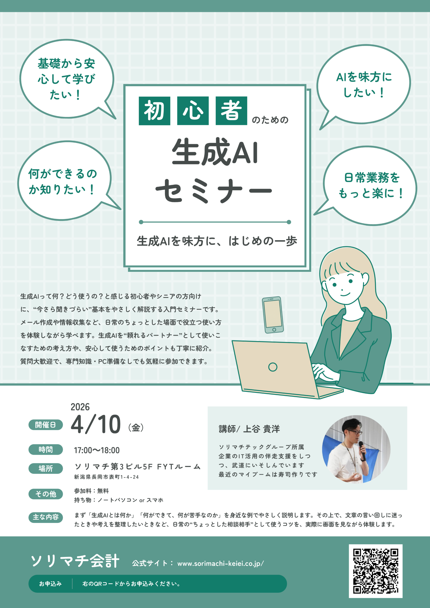 2026年4月10日(金)、当法人と同グループである税理士法人ソリマチ会計主催の「初心者のための生成AIセミナー」にて、当社AXコンサルティング株式会社の上谷が講師として登壇いたします。